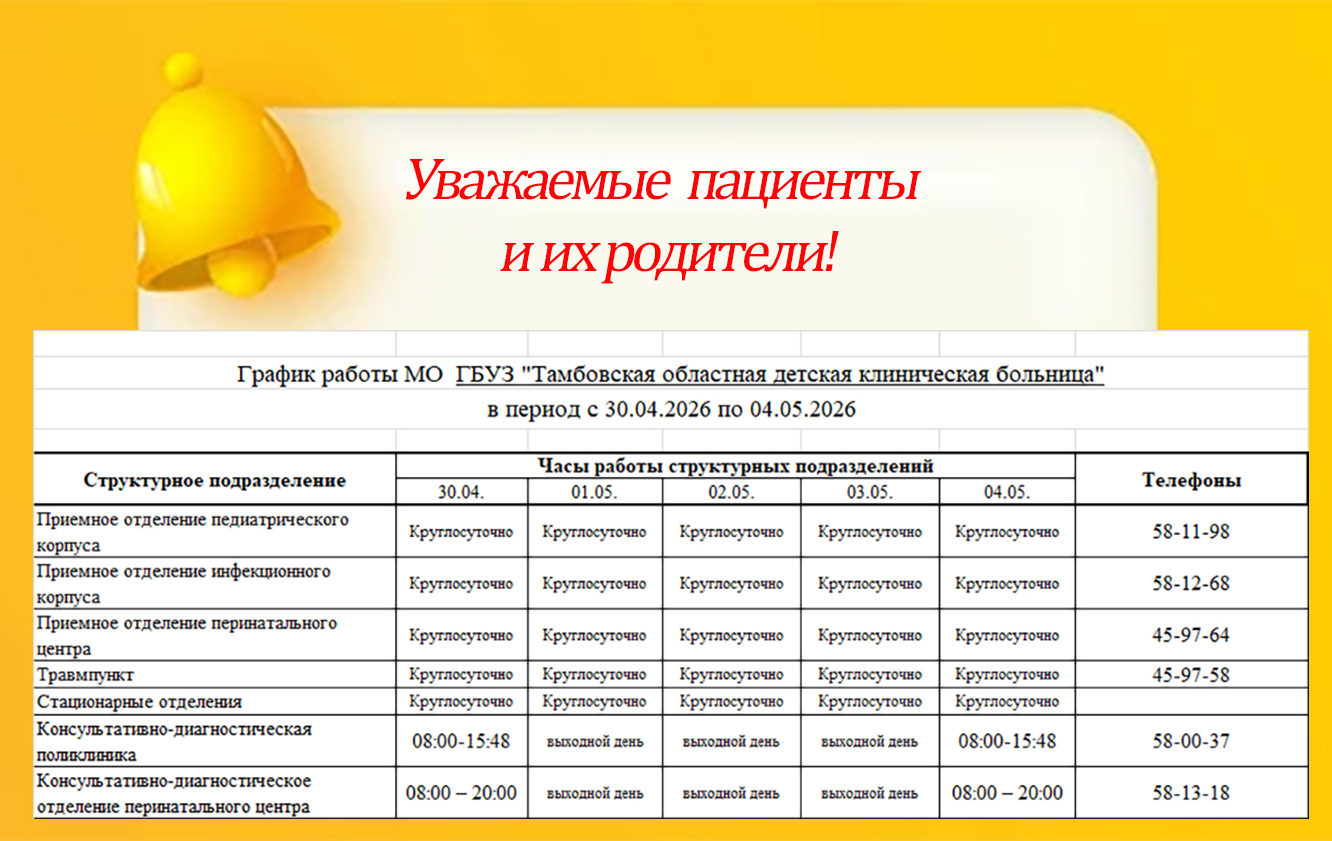 График работы ГБУЗ "Тамбовская областная детская клиническая больница" в период с 30.04.2026 по 04.05.2026