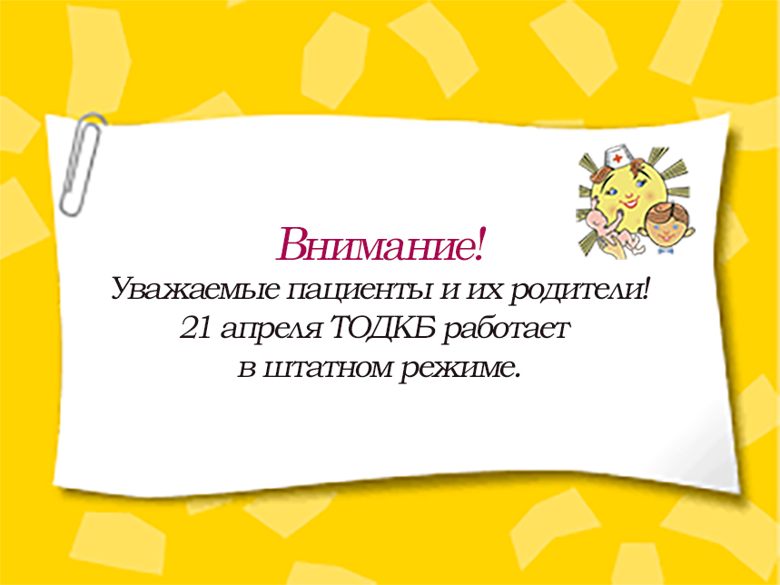 Уважаемые пациенты и их родители! 21 апреля ТОДКБ работает в штатном режиме