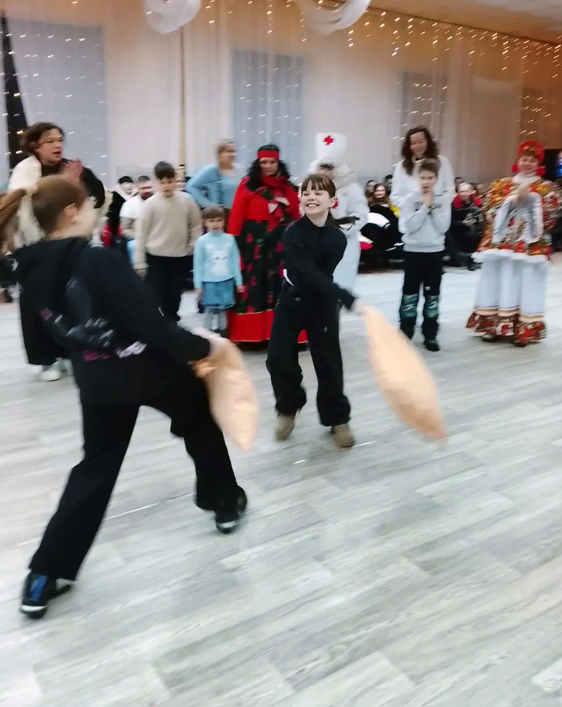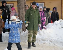 Надышавшись морозным февральским воздухом, гости продолжили празднование на закрытом танцполе лагеря. Здесь также и взрослые, и дети имели возможность посоревноваться в силе и ловкости. Одним из самых незабываемых состязаний праздника стали бои подушками. ![]()