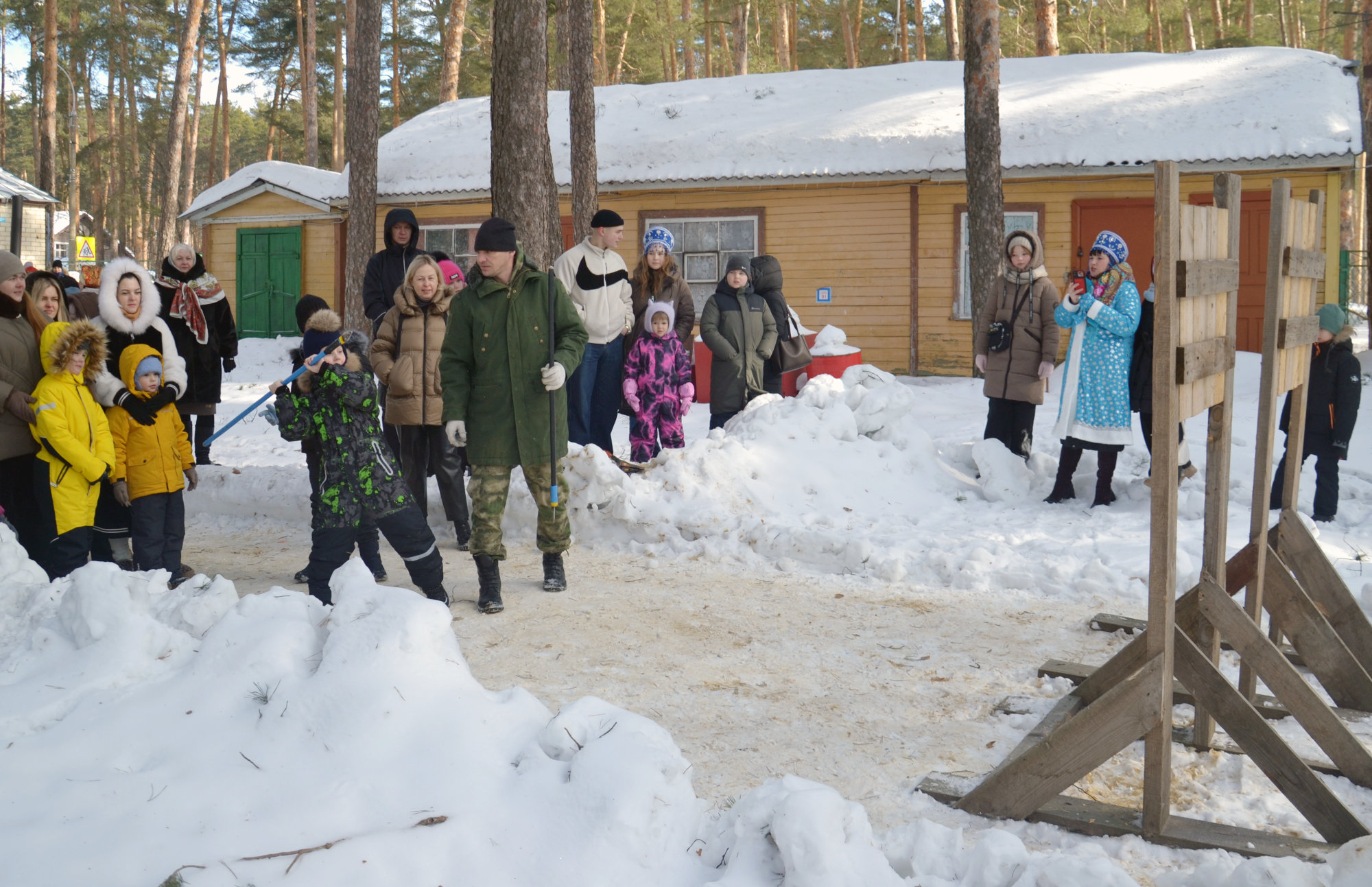 Надышавшись морозным февральским воздухом, гости продолжили празднование на закрытом танцполе лагеря. Здесь также и взрослые, и дети имели возможность посоревноваться в силе и ловкости. Одним из самых незабываемых состязаний праздника стали бои подушками. ![]()